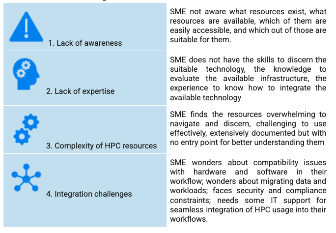 It is useful for NCC consultants to understand the implications of each of these challenges in order to best assess the SME needs and better support them in their HPC access journey.
