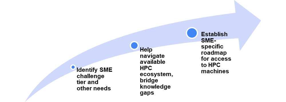 • SMEs that are aware of EuroHPC JU infrastructure but need assistance in navigating the plethora of EuroHPC JU resources in order to successfully apply for access.