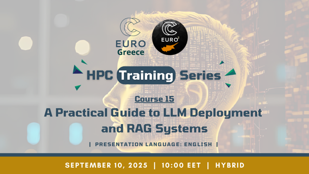 EuroCC@Greece, in collaboration with EuroCC Cyprus, announced the 15th Course of HPC Training Series, titled “A Practical Guide to LLM Deployment and RAG Systems”, which took place on-site and online (hybrid), on September 10th, 2025.